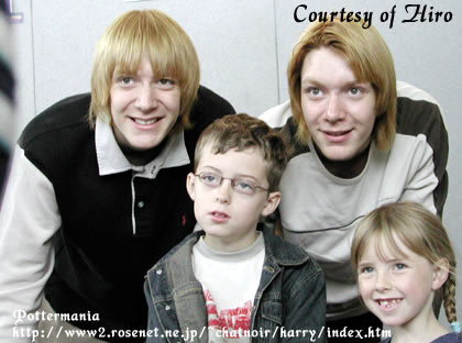 私は情けないことにほとんど英語が聞き取れず、凄くもったいなかったのですが、いくつか聞き取れたところでは(それも怪しいのですが)、「どこのシーンが良かったか」という質問にジェームスが「9と4分の3番線のシーンで、ウィーズリー夫人役のジュリーさんが面白かった(funny)ので、撮影が楽しかった」マシューは「『なんでいつも僕なの?』と言ってシャンデリアに吊られるところが、首がちょっと苦しかったけど、楽しかった」、と答えていました。また「キャラクターで誰が好きか」という質問に対して、ジェームズがすかさず「フレッド」と答え、オリバーは「やっぱりジョージかな」クリスチャンは「4巻に出てくる、ビクトール・・・なんだっけ(ここで会場からすぐに「クラム!」と声が・笑)そうそう、クラム。彼がいいね」マシューは「リーマスが好き(理由を言ったのですが、わかりませんでした・涙)